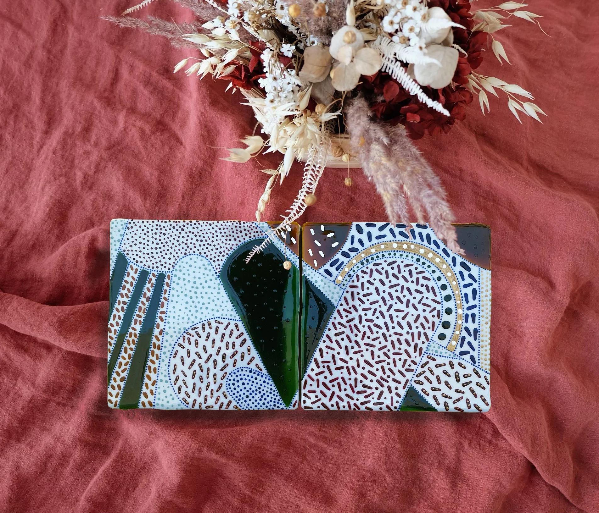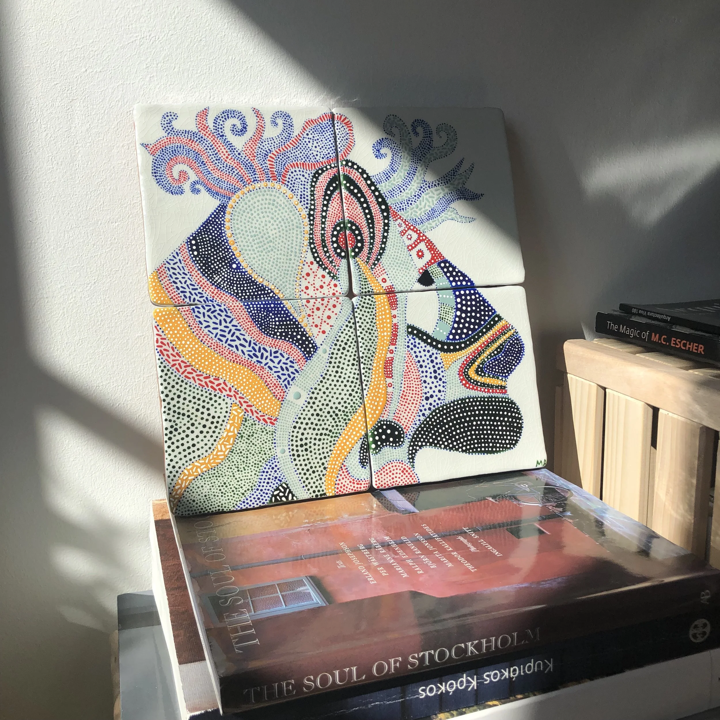 The charm of the simplicity of one color comes to tile design with the Affinity Collection. This special edition of tile murals consists of six compositions painted in only one color. Each composition has a different tile–paint color combination and illustrates affinities and intentional promises.